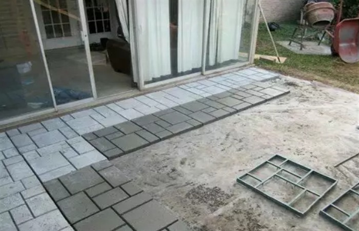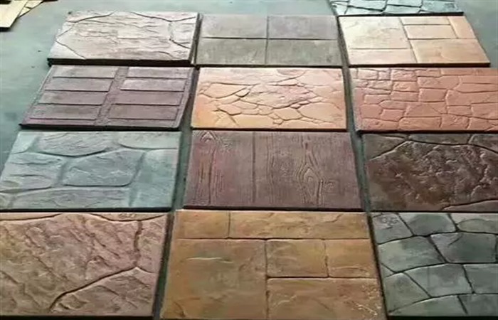 5、使用藝術地坪模具對地坪面層進行紋理處理。藝術地坪模具應配套使用,首先確定好紋理的分布方向,選好第一塊模具放置的位置和角度,然后其它的模具依次緊貼第一塊模具放置。彩色混凝土藝術地坪壓模采用人工壓模,壓模應由技術較好的人員進行作業以保證壓紋深度一致和模具放置的準確性。
