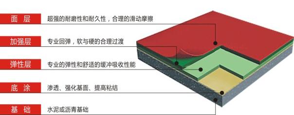 專業性能_獨特的雙層結構,具有良好的減震和回彈性,既可使運動員迅捷起動,又可緩解運動中的沖擊力,安全舒適,為運動員提供了安全的運動場地,是專業球場的首選材料。