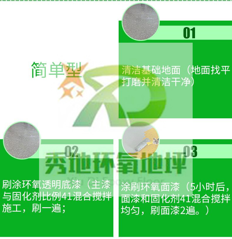 環氧地坪_秀地環氧地坪是一種無接縫、質地堅實、耐藥品性佳、防腐、防塵、保養方便、維護費用低廉等優點。可根據不同的用途要求設計多種方案:1-5mm厚的自流平地面,防滑耐磨涂裝,砂漿型涂裝,防靜電,防腐蝕涂裝等。環氧地坪大致可以分為:環氧樹脂磨石地坪、環氧樹脂彩砂壓砂地坪、環氧樹脂自流平地坪、環氧樹脂砂漿型地坪、環氧樹脂平涂型地坪。一般環氧地坪,也叫涂裝型環氧地坪、裝飾性及潔凈度等需要不高的場所,如倉庫、一般出產車間等等。