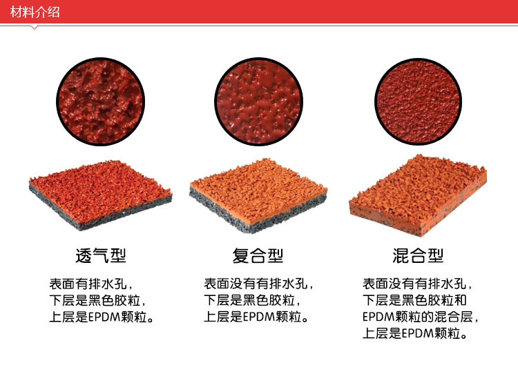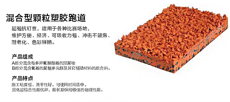 混合型塑膠跑道是由全PU摻雜部分橡膠顆粒為底層,聚氨酯顆粒與塑膠漿為面層鋪設組成的高性能塑膠結構。它是國際田聯認可的運動場地。可全天候使用,雨后能立即使用,具有彈性好、耐磨、耐高低溫、沖擊吸收性好等特點,實用性強,日常維護簡單易行。混合型塑膠跑道價格適中,適合各級標準比賽、訓練體育運動館、各大群體活動運動場。